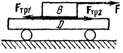 Пример 1 . Пусть, внешняя сила F действует на брусок В , который может скользить по тележке D (рис. 5). Если тележка перемещается вправо, то работа силы трения скольжения F tr2 , действующей на тележку со стороны бруска, положительна: